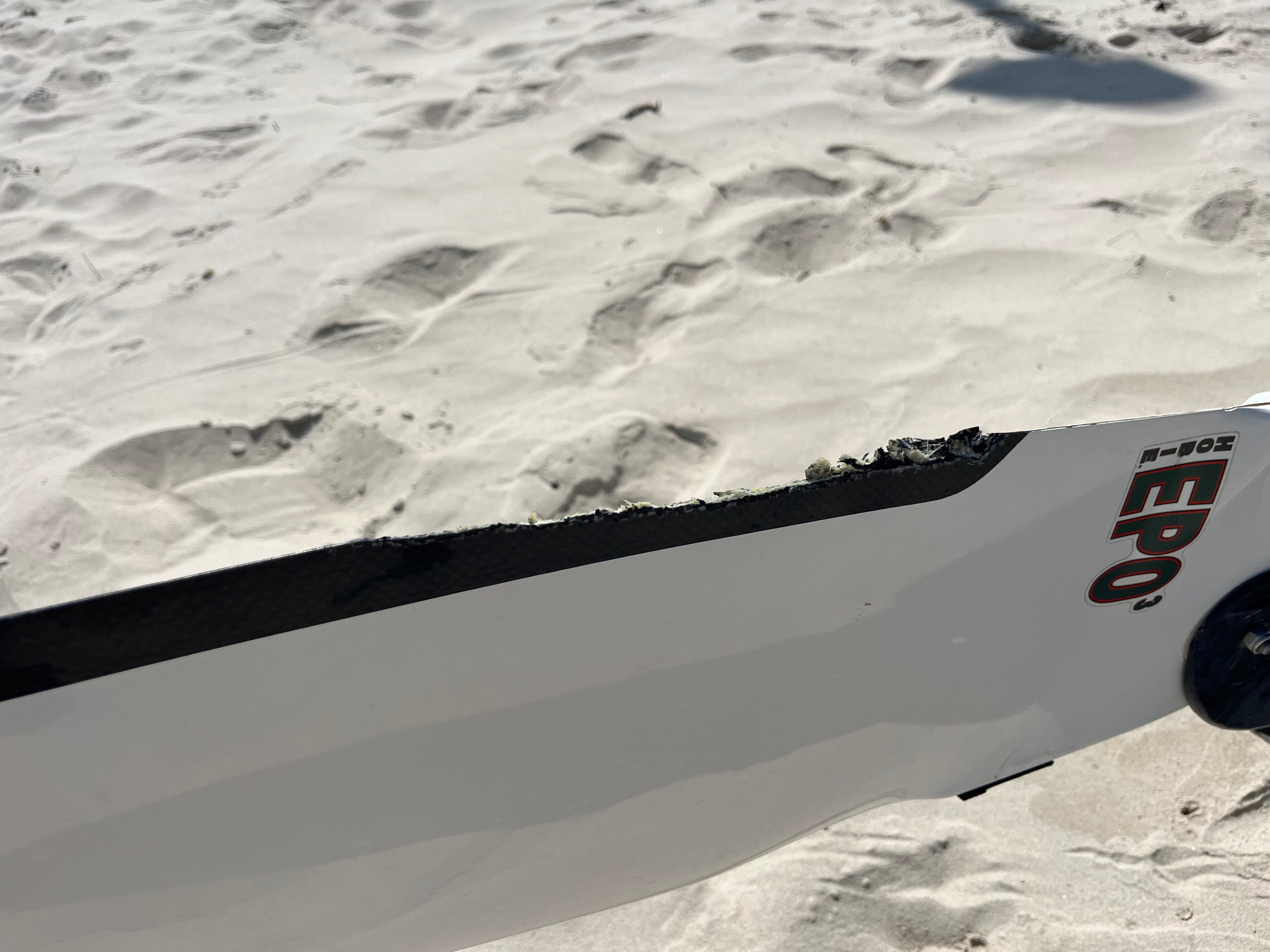 This EPO-3 Rudder was damaged when sailing. We dried out the rudder, sanded back the damaged area and began to reinforce the leading edge. The repair was grinded down...