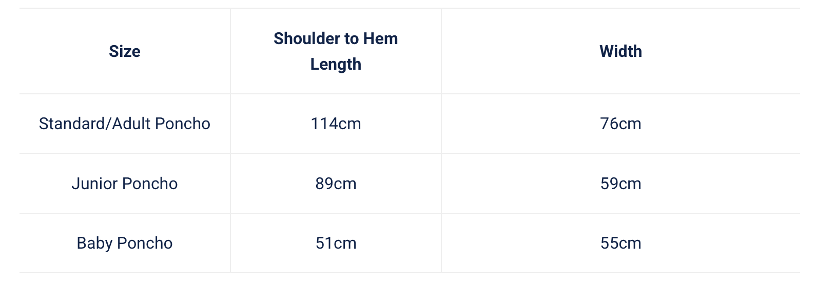 ROOSTER PONCHO SIZE GUIDE